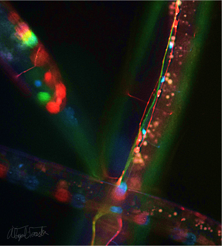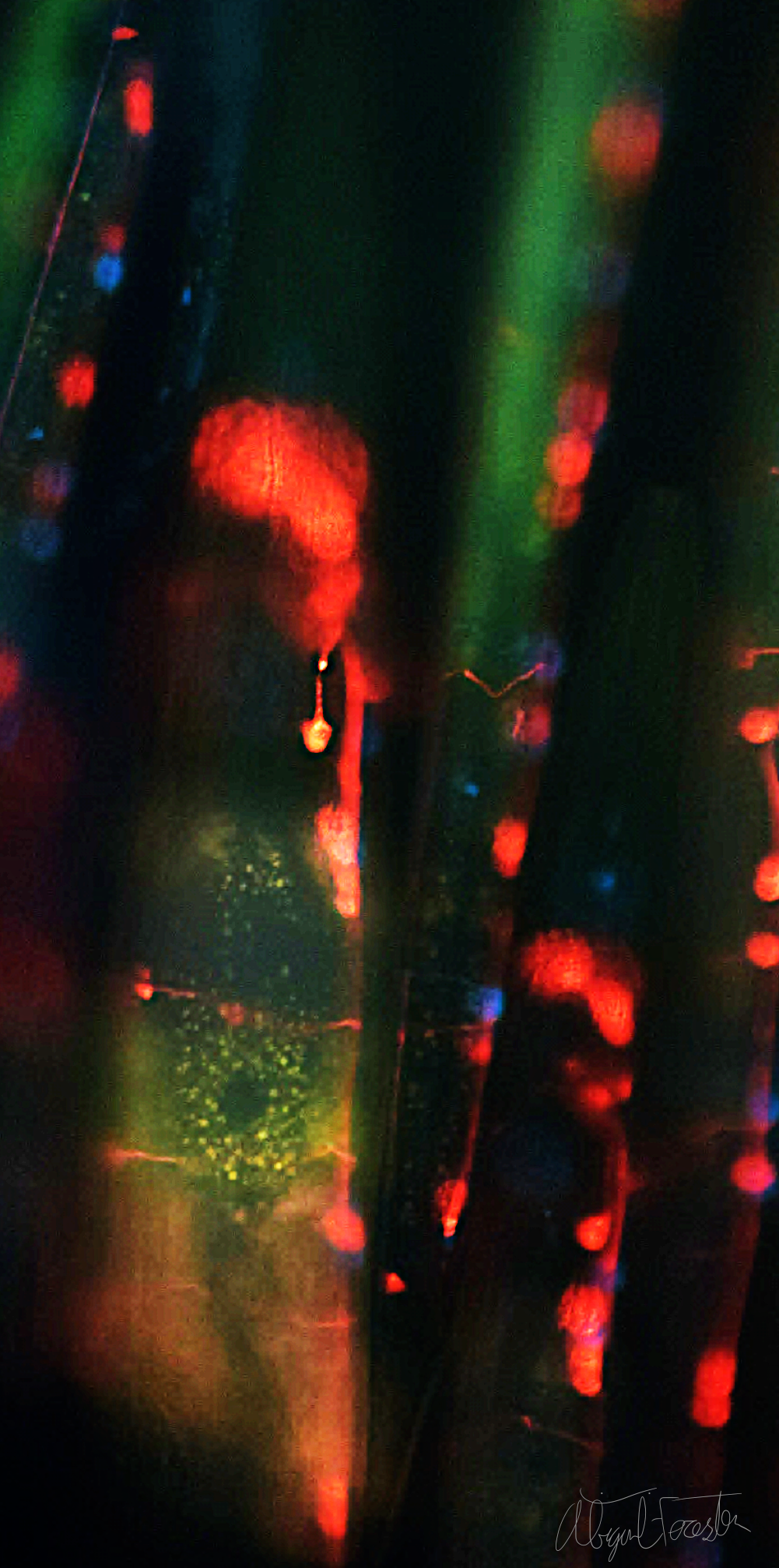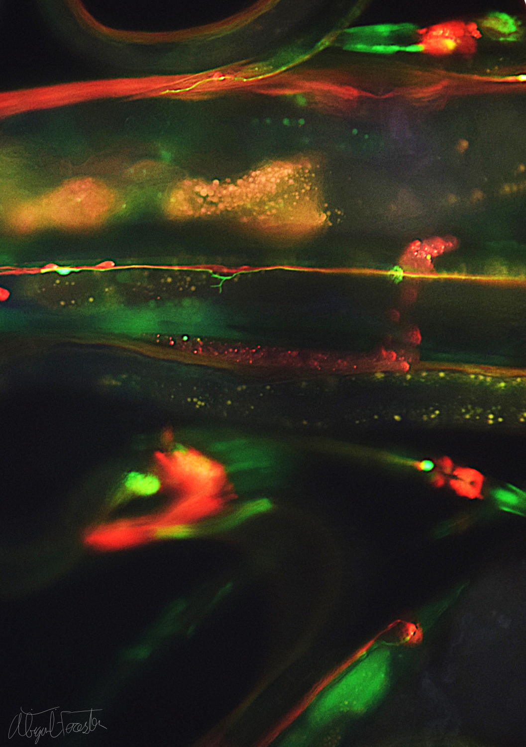 In my research as a PhD student I studied brain development in microscopic worms using a type of genetic fluorescence marking that made specific neuron types fluoresce different colours. This was very pretty to look at throughout the microscope, so I took a series of photographs through the microscope of particularly lovely things I saw.